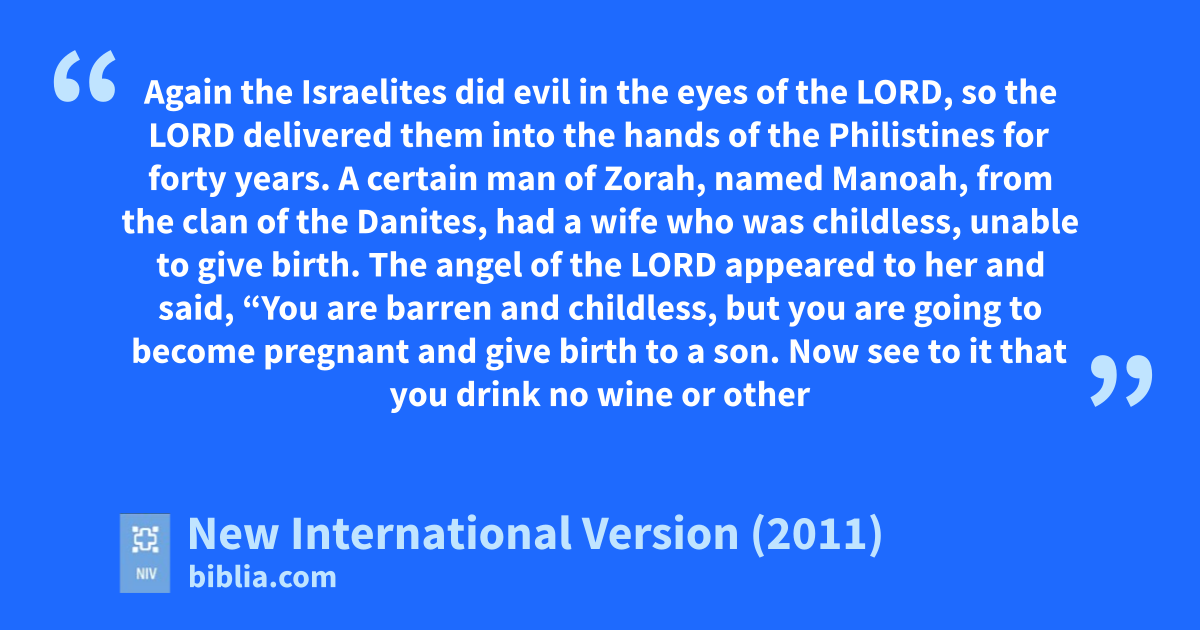 2 A certain man of Zorah,s named Manoah,t from the clan of the Danites,u had a wife who was childless,v unable to give birth. 3 The angel of the Lordw appeared to herx and said, “You are barren and childless, but you are going to become pregnant and give birth to a son.y 4 Now see to it that you drink no wine or other fermented drinkz and that you do not eat anything unclean.a 5 You will become pregnant and have a sonb whose head is never to be touched by a razorc because the boy is to be a Nazirite,d dedicated to God from the womb. He will take the leade in delivering Israel from the hands of the Philistines.”