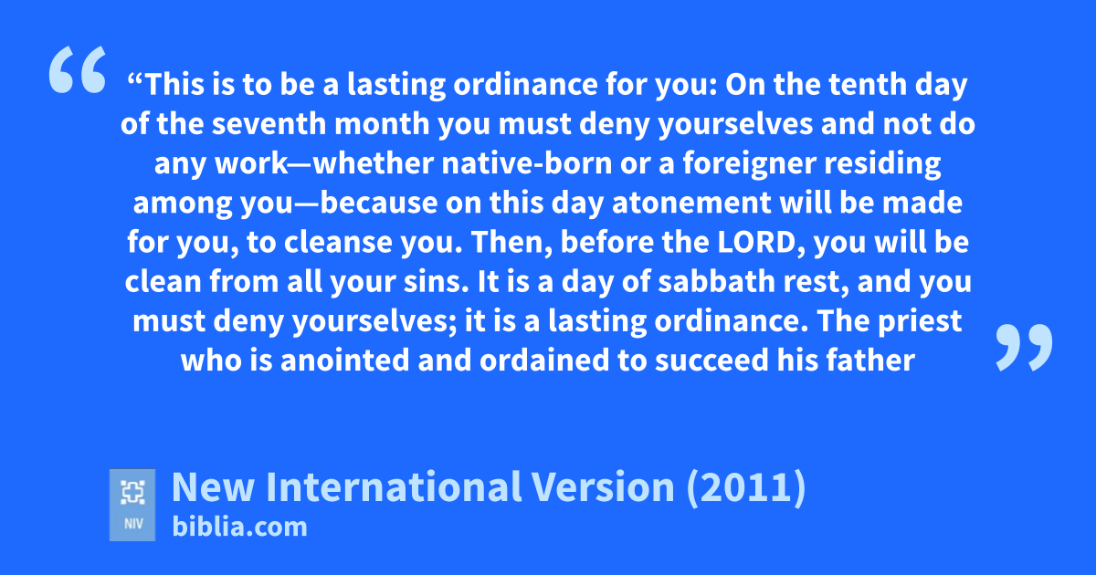 29 “This is to be a lasting ordinancez for you: On the tenth day of the seventh montha you must deny yourselvesc b and not do any workc—whether native-bornd or a foreigner residing among you—30 because on this day atonement will be madee for you, to cleanse you. Then, before the Lord, you will be clean from all your sins.f 31 It is a day of sabbath rest, and you must deny yourselves;g it is a lasting ordinance.h 32 The priest who is anointed and ordainedi to succeed his father as high priest is to make atonement. He is to put on the sacred linen garmentsj 33 and make atonement for the Most Holy Place, for the tent of meeting and the altar, and for the priests and all the members of the community.k
