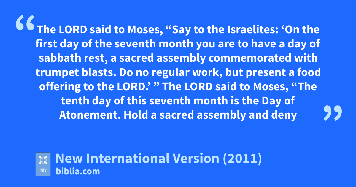 23 The Lord said to Moses, 24 “Say to the Israelites: ‘On the first day of the seventh month you are to have a day of sabbath rest, a sacred assemblym commemorated with trumpet blasts.n 25 Do no regular work,o but present a food offering to the Lord.p’ ”