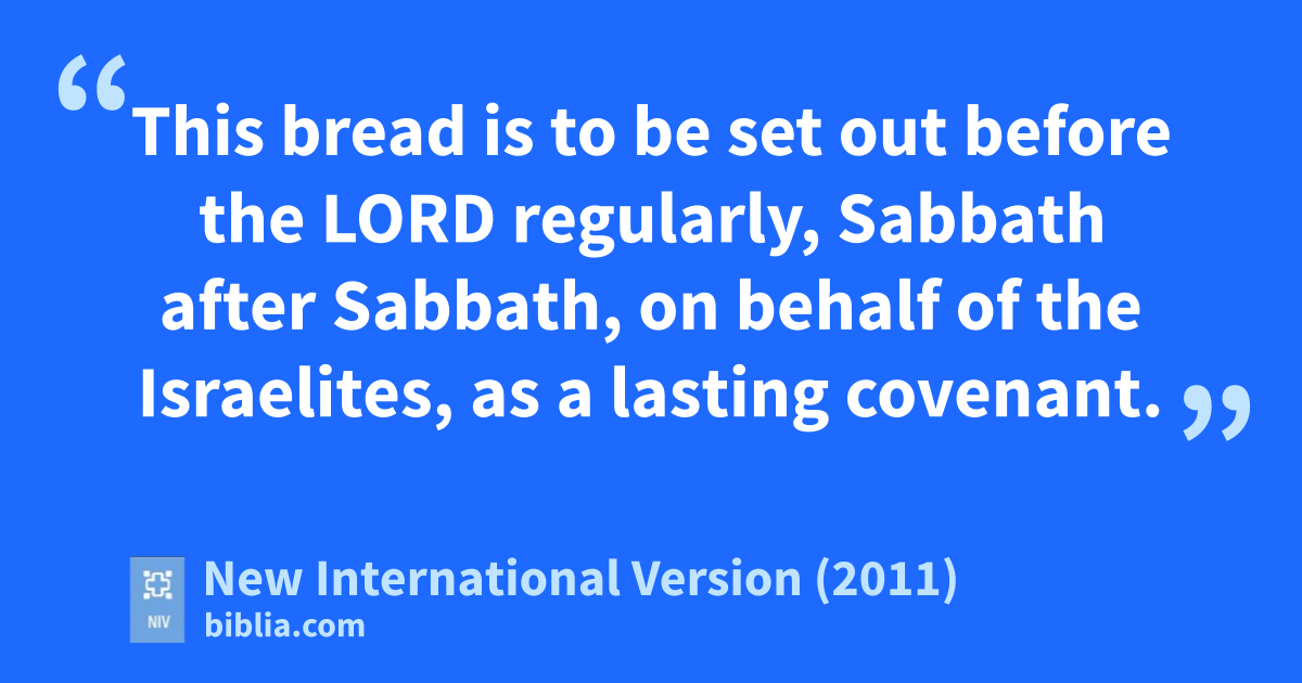 5 “Take the finest flour and bake twelve loaves of bread,s using two-tenths of an ephaha t for each loaf. 6 Arrange them in two stacks, six in each stack, on the table of pure goldu before the Lord. 7 By each stack put some pure incensev as a memorialb portionw to represent the bread and to be a food offering presented to the Lord. 8 This bread is to be set out before the Lord regularly,x Sabbath after Sabbath,y on behalf of the Israelites, as a lasting covenant. 9 It belongs to Aaron and his sons,z who are to eat it in the sanctuary area,a because it is a most holyb part of their perpetual share of the food offerings presented to the Lord.”