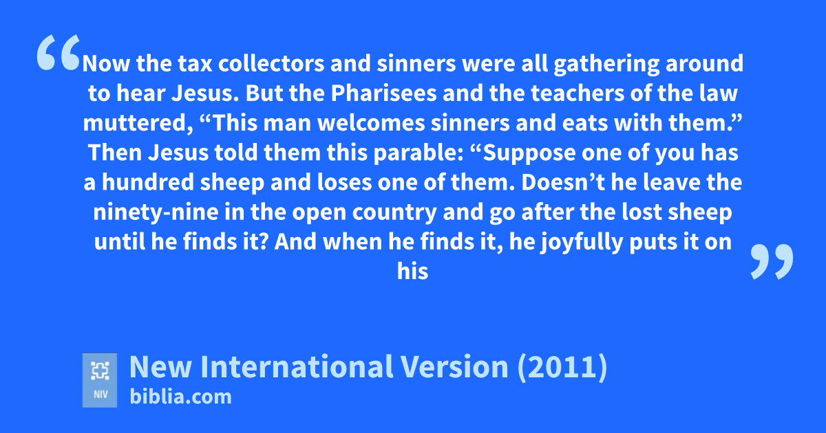 3 Then Jesus told them this parable:u 4 “Suppose one of you has a hundred sheep and loses one of them. Doesn’t he leave the ninety-nine in the open country and go after the lost sheep until he finds it?v 5 And when he finds it, he joyfully puts it on his shoulders 6 and goes home. Then he calls his friends and neighbors together and says, ‘Rejoice with me; I have found my lost sheep.’w 7 I tell you that in the same way there will be more rejoicing in heaven over one sinner who repents than over ninety-nine righteous persons who do not need to repent.x