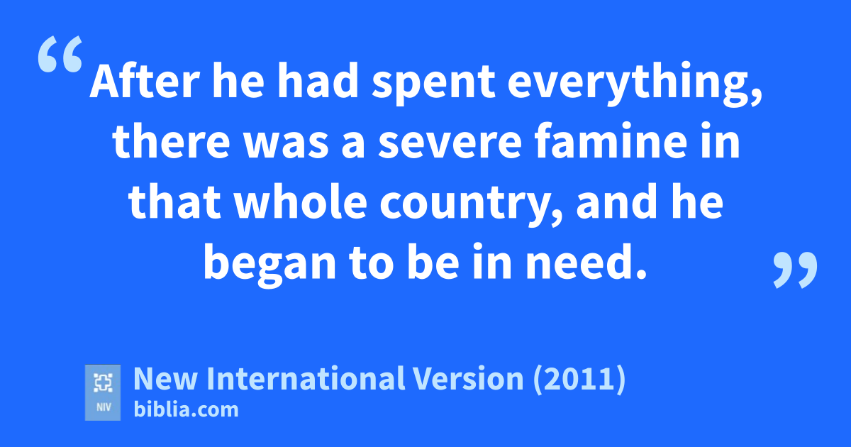 13 “Not long after that, the younger son got together all he had, set off for a distant country and there squandered his wealthd in wild living. 14 After he had spent everything, there was a severe famine in that whole country, and he began to be in need. 15 So he went and hired himself out to a citizen of that country, who sent him to his fields to feed pigs.e 16 He longed to fill his stomach with the pods that the pigs were eating, but no one gave him anything.