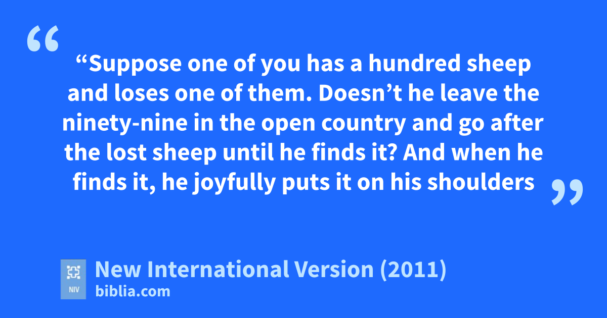 3 Then Jesus told them this parable:u 4 “Suppose one of you has a hundred sheep and loses one of them. Doesn’t he leave the ninety-nine in the open country and go after the lost sheep until he finds it?v 5 And when he finds it, he joyfully puts it on his shoulders 6 and goes home. Then he calls his friends and neighbors together and says, ‘Rejoice with me; I have found my lost sheep.’w 7 I tell you that in the same way there will be more rejoicing in heaven over one sinner who repents than over ninety-nine righteous persons who do not need to repent.x