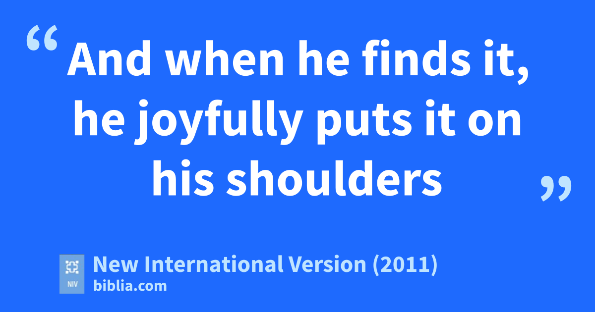3 Then Jesus told them this parable:u 4 “Suppose one of you has a hundred sheep and loses one of them. Doesn’t he leave the ninety-nine in the open country and go after the lost sheep until he finds it?v 5 And when he finds it, he joyfully puts it on his shoulders 6 and goes home. Then he calls his friends and neighbors together and says, ‘Rejoice with me; I have found my lost sheep.’w 7 I tell you that in the same way there will be more rejoicing in heaven over one sinner who repents than over ninety-nine righteous persons who do not need to repent.x