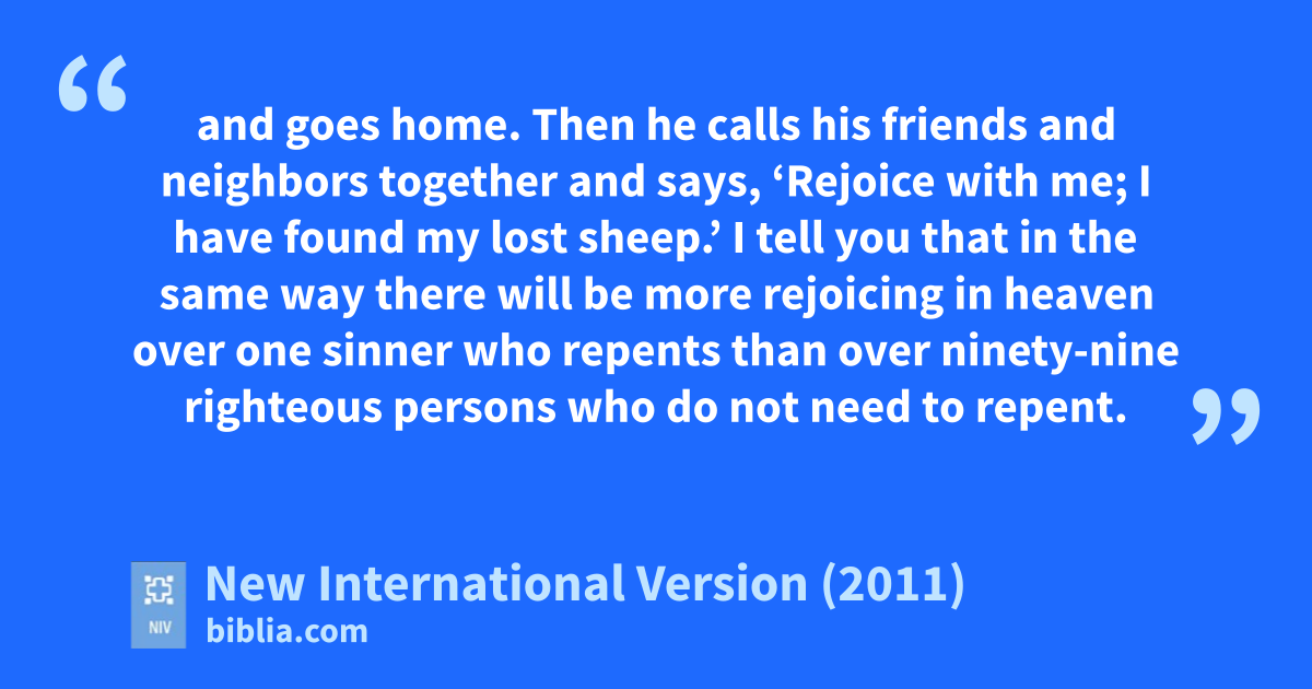3 Then Jesus told them this parable:u 4 “Suppose one of you has a hundred sheep and loses one of them. Doesn’t he leave the ninety-nine in the open country and go after the lost sheep until he finds it?v 5 And when he finds it, he joyfully puts it on his shoulders 6 and goes home. Then he calls his friends and neighbors together and says, ‘Rejoice with me; I have found my lost sheep.’w 7 I tell you that in the same way there will be more rejoicing in heaven over one sinner who repents than over ninety-nine righteous persons who do not need to repent.x