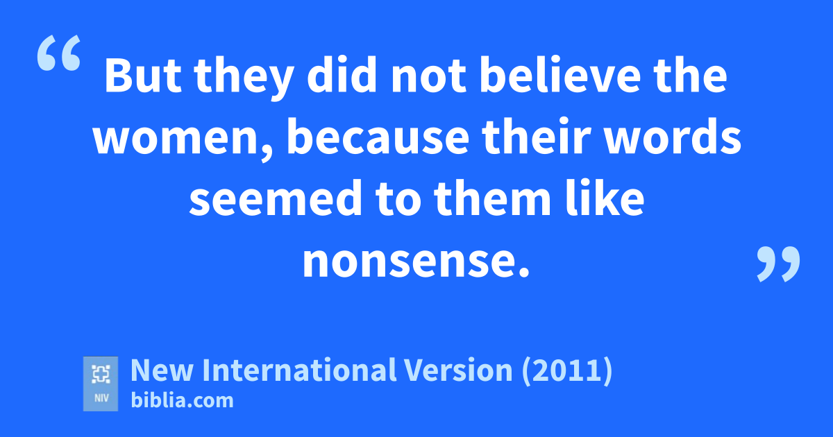 9 When they came back from the tomb, they told all these things to the Eleven and to all the others. 10 It was Mary Magdalene, Joanna, Mary the mother of James, and the others with themb who told this to the apostles.c 11 But they did not believed the women, because their words seemed to them like nonsense. 12 Peter, however, got up and ran to the tomb. Bending over, he saw the strips of linen lying by themselves,e and he went away,f wondering to himself what had happened.
