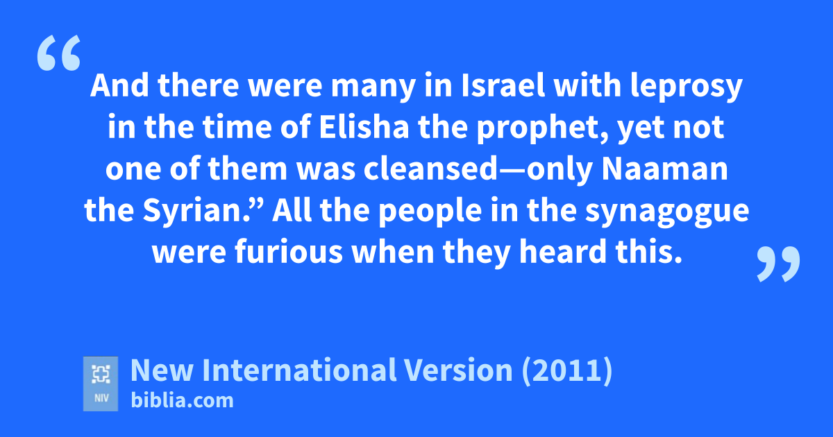 24 “Truly I tell you,” he continued, “no prophet is accepted in his hometown.w 25 I assure you that there were many widows in Israel in Elijah’s time, when the sky was shut for three and a half years and there was a severe famine throughout the land.x 26 Yet Elijah was not sent to any of them, but to a widow in Zarephath in the region of Sidon.y 27 And there were many in Israel with leprosyg in the time of Elisha the prophet, yet not one of them was cleansed—only Naaman the Syrian.”z