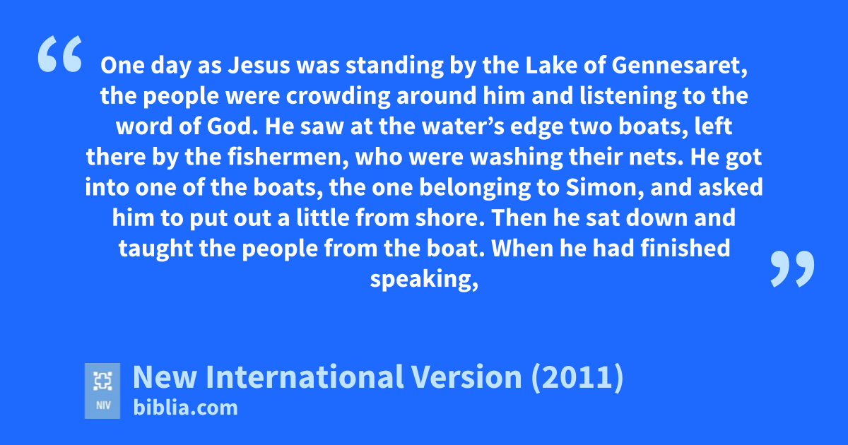 5 One day as Jesus was standing by the Lake of Gennesaret,a the people were crowding around him and listening to the word of God.v 2 He saw at the water’s edge two boats, left there by the fishermen, who were washing their nets. 3 He got into one of the boats, the one belonging to Simon, and asked him to put out a little from shore. Then he sat down and taught the people from the boat.w