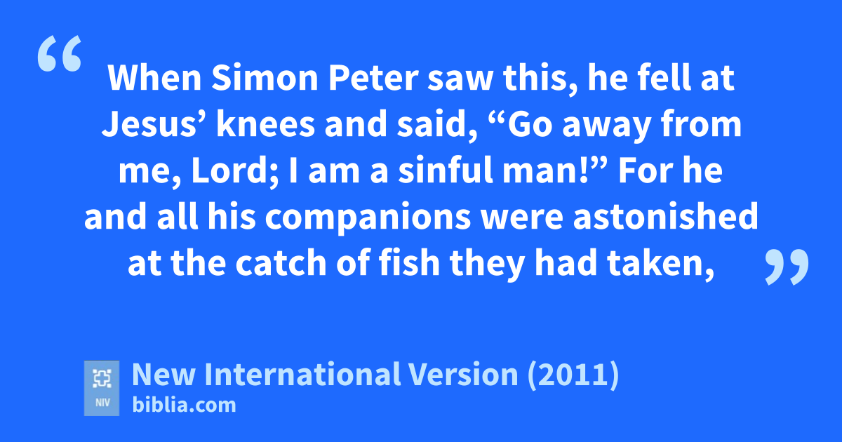 8 When Simon Peter saw this, he fell at Jesus’ knees and said, “Go away from me, Lord; I am a sinful man!”b 9 For he and all his companions were astonished at the catch of fish they had taken, 10 and so were James and John, the sons of Zebedee, Simon’s partners.