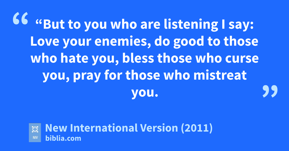 27 “But to you who are listening I say: Love your enemies, do good to those who hate you,b 28 bless those who curse you, pray for those who mistreat you.c 29 If someone slaps you on one cheek, turn to them the other also. If someone takes your coat, do not withhold your shirt from them. 30 Give to everyone who asks you, and if anyone takes what belongs to you, do not demand it back.d 31 Do to others as you would have them do to you.e