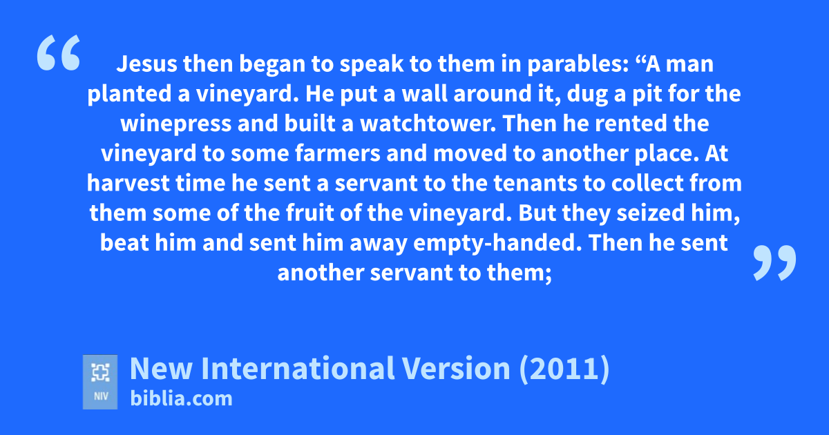 12 Jesus then began to speak to them in parables: “A man planted a vineyard.w He put a wall around it, dug a pit for the winepress and built a watchtower. Then he rented the vineyard to some farmers and moved to another place. 2 At harvest time he sent a servant to the tenants to collect from them some of the fruit of the vineyard. 3 But they seized him, beat him and sent him away empty-handed. 4 Then he sent another servant to them; they struck this man on the head and treated him shamefully. 5 He sent still another, and that one they killed. He sent many others; some of them they beat, others they killed.