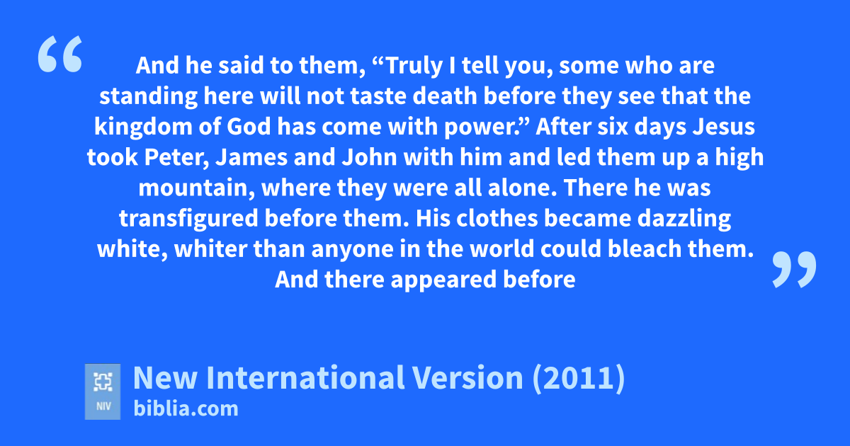 2 After six days Jesus took Peter, James and Johnr with him and led them up a high mountain, where they were all alone. There he was transfigured before them. 3 His clothes became dazzling white,s whiter than anyone in the world could bleach them. 4 And there appeared before them Elijah and Moses, who were talking with Jesus.
