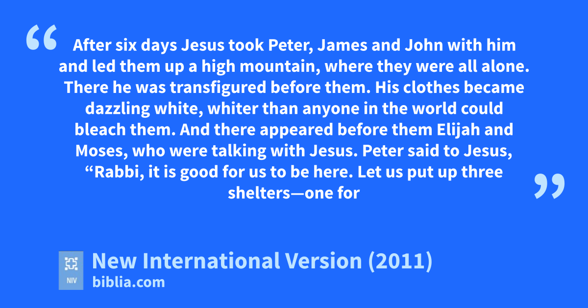 2 After six days Jesus took Peter, James and Johnr with him and led them up a high mountain, where they were all alone. There he was transfigured before them. 3 His clothes became dazzling white,s whiter than anyone in the world could bleach them. 4 And there appeared before them Elijah and Moses, who were talking with Jesus.