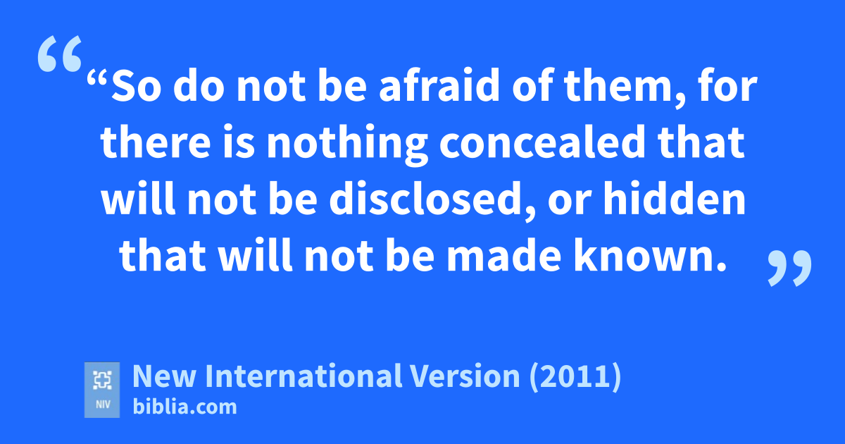 26 “So do not be afraid of them, for there is nothing concealed that will not be disclosed, or hidden that will not be made known.b 27 What I tell you in the dark, speak in the daylight; what is whispered in your ear, proclaim from the roofs. 28 Do not be afraid of those who kill the body but cannot kill the soul. Rather, be afraid of the Onec who can destroy both soul and body in hell. 29 Are not two sparrows sold for a penny? Yet not one of them will fall to the ground outside your Father’s care.b 30 And even the very hairs of your head are all numbered.d 31 So don’t be afraid; you are worth more than many sparrows.e