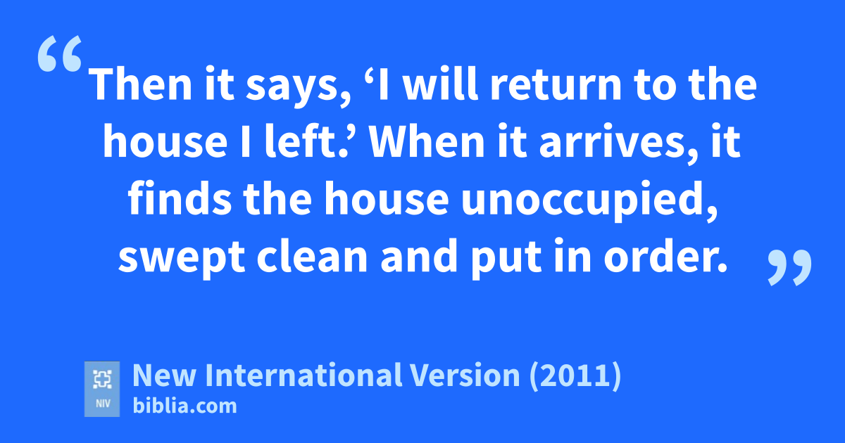 43 “When an impure spirit comes out of a person, it goes through arid places seeking rest and does not find it. 44 Then it says, ‘I will return to the house I left.’ When it arrives, it finds the house unoccupied, swept clean and put in order. 45 Then it goes and takes with it seven other spirits more wicked than itself, and they go in and live there. And the final condition of that person is worse than the first.q That is how it will be with this wicked generation.”