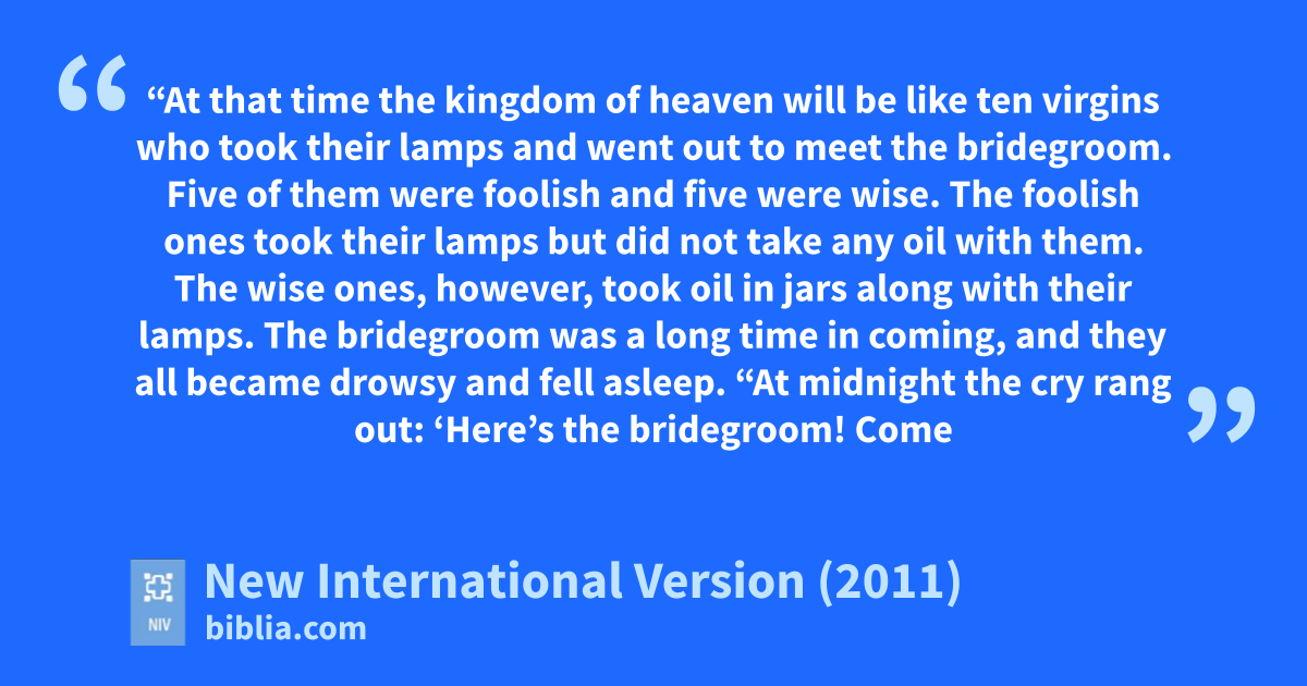 25 “At that time the kingdom of heaven will be liked ten virgins who took their lampse and went out to meet the bridegroom.f 2 Five of them were foolish and five were wise.g 3 The foolish ones took their lamps but did not take any oil with them. 4 The wise ones, however, took oil in jars along with their lamps. 5 The bridegroom was a long time in coming, and they all became drowsy and fell asleep.h