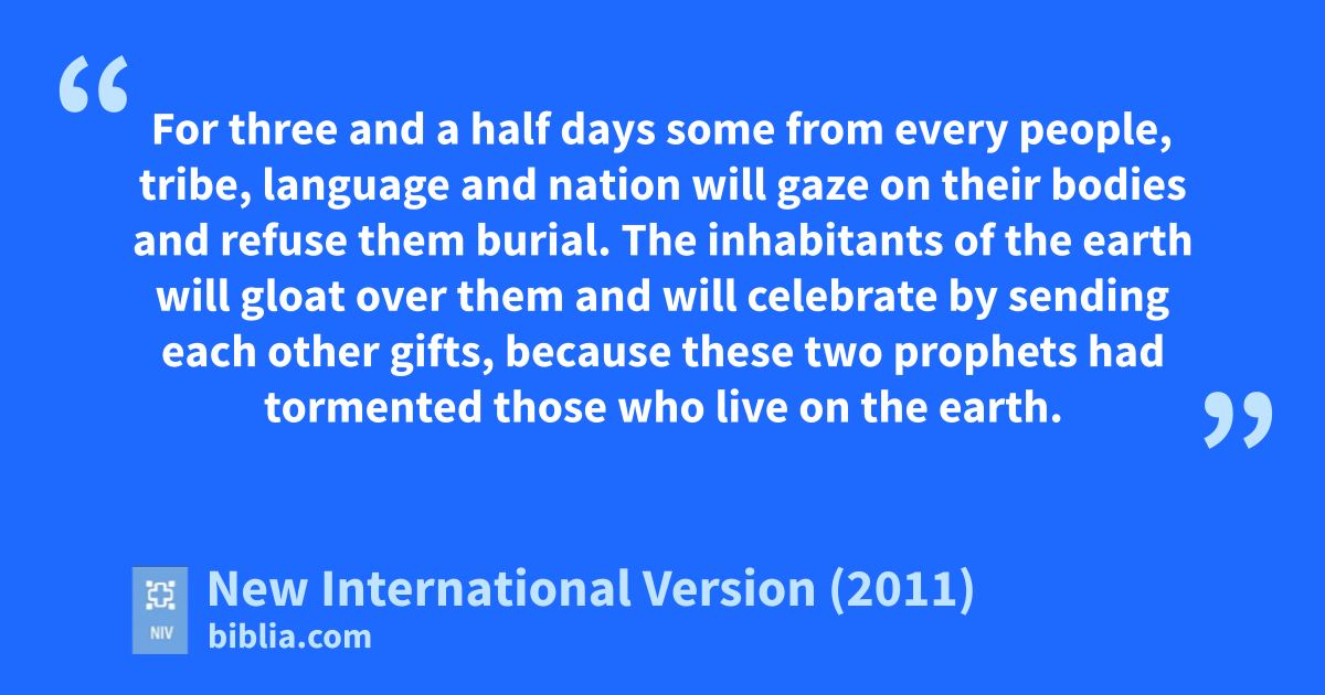 7 Now when they have finished their testimony, the beasth that comes up from the Abyssi will attack them,j and overpower and kill them. 8 Their bodies will lie in the public square of the great cityk—which is figuratively called Sodoml and Egypt—where also their Lord was crucified.m 9 For three and a half days some from every people, tribe, language and nationn will gaze on their bodies and refuse them burial.o 10 The inhabitants of the earthp will gloat over them and will celebrate by sending each other gifts,q because these two prophets had tormented those who live on the earth.