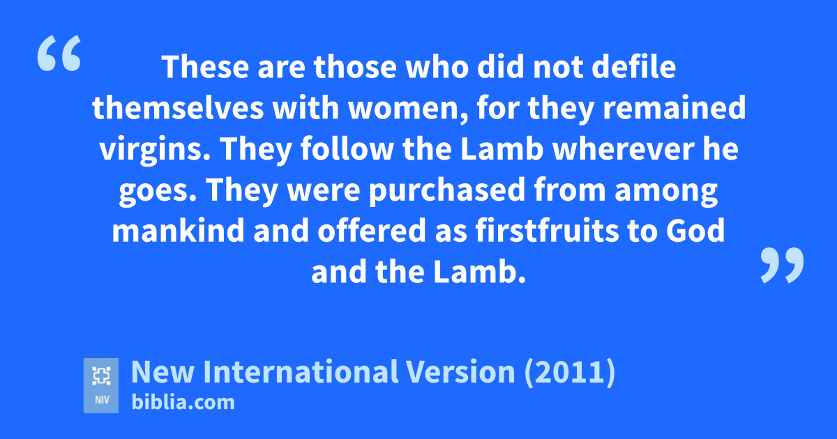 14 Then I looked, and there before me was the Lamb,y standing on Mount Zion,z and with him 144,000a who had his name and his Father’s nameb written on their foreheads.c 2 And I heard a sound from heaven like the roar of rushing watersd and like a loud peal of thunder.e The sound I heard was like that of harpists playing their harps.f 3 And they sang a new songg before the throne and before the four living creaturesh and the elders.i No one could learn the song except the 144,000j who had been redeemed from the earth. 4 These are those who did not defile themselves with women, for they remained virgins.k They follow the Lamb wherever he goes.l They were purchased from among mankindm and offered as firstfruitsn to God and the Lamb. 5 No lie was found in their mouths;o they are blameless.p
