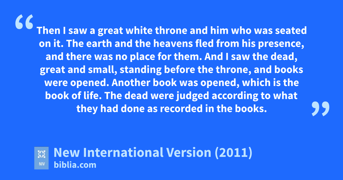 11 Then I saw a great white thronex and him who was seated on it. The earth and the heavens fled from his presence,y and there was no place for them. 12 And I saw the dead, great and small,z standing before the throne, and books were opened.a Another book was opened, which is the book of life.b The dead were judgedc according to what they had doned as recorded in the books. 13 The sea gave up the dead that were in it, and death and Hadese gave up the deadf that were in them, and each person was judged according to what they had done.g 14 Then deathh and Hadesi were thrown into the lake of fire.j The lake of fire is the second death.k 15 Anyone whose name was not found written in the book of lifel was thrown into the lake of fire.