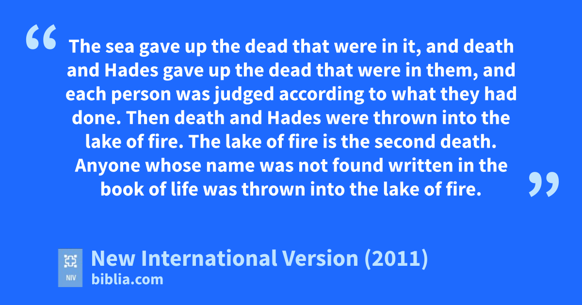 11 Then I saw a great white thronex and him who was seated on it. The earth and the heavens fled from his presence,y and there was no place for them. 12 And I saw the dead, great and small,z standing before the throne, and books were opened.a Another book was opened, which is the book of life.b The dead were judgedc according to what they had doned as recorded in the books. 13 The sea gave up the dead that were in it, and death and Hadese gave up the deadf that were in them, and each person was judged according to what they had done.g 14 Then deathh and Hadesi were thrown into the lake of fire.j The lake of fire is the second death.k 15 Anyone whose name was not found written in the book of lifel was thrown into the lake of fire.