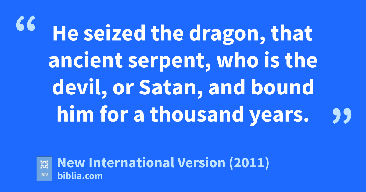 20 And I saw an angel coming down out of heaven,o having the keyp to the Abyssq and holding in his hand a great chain. 2 He seized the dragon, that ancient serpent, who is the devil, or Satan,r and bound him for a thousand years.s 3 He threw him into the Abyss,t and locked and sealedu it over him, to keep him from deceiving the nationsv anymore until the thousand years were ended. After that, he must be set free for a short time.