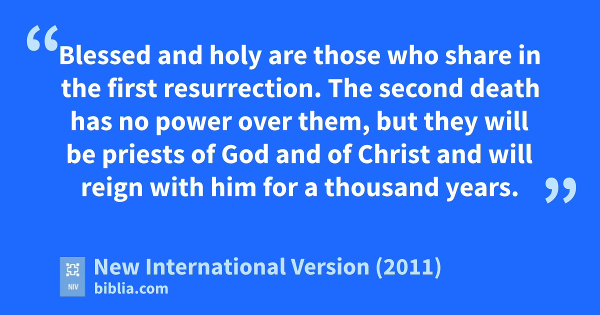 4 I saw thronesw on which were seated those who had been given authority to judge.x And I saw the souls of those who had been beheadedy because of their testimony about Jesusz and because of the word of God.a Theya had not worshiped the beastb or its image and had not received its mark on their foreheads or their hands.c They came to life and reignedd with Christ a thousand years. 5 (The rest of the dead did not come to life until the thousand years were ended.) This is the first resurrection.e 6 Blessedf and holy are those who share in the first resurrection. The second deathg has no power over them, but they will be priestsh of God and of Christ and will reign with himi for a thousand years.