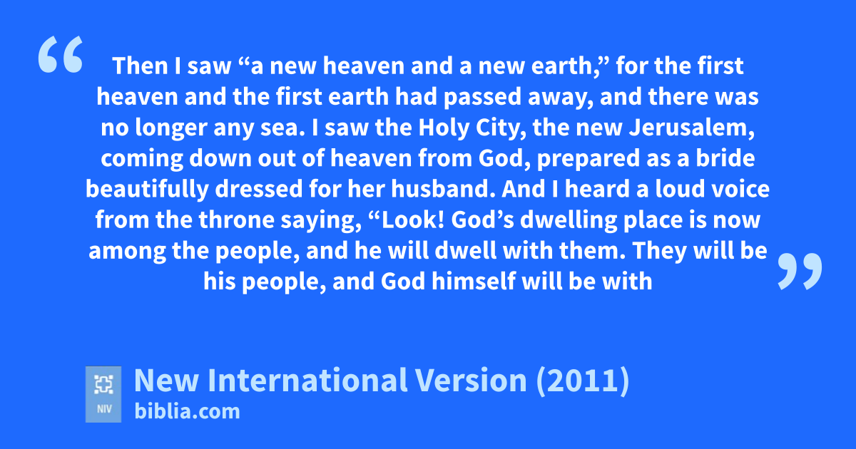 21 Then I saw “a new heaven and a new earth,”a m for the first heaven and the first earth had passed away,n and there was no longer any sea. 2 I saw the Holy City,o the new Jerusalem, coming down out of heaven from God,p prepared as a brideq beautifully dressed for her husband. 3 And I heard a loud voice from the throne saying, “Look! God’s dwelling place is now among the people, and he will dwell with them.r They will be his people, and God himself will be with them and be their God.s 4 ‘He will wipe every tear from their eyes.t There will be no more death’b u or mourning or crying or pain,v for the old order of things has passed away.”w