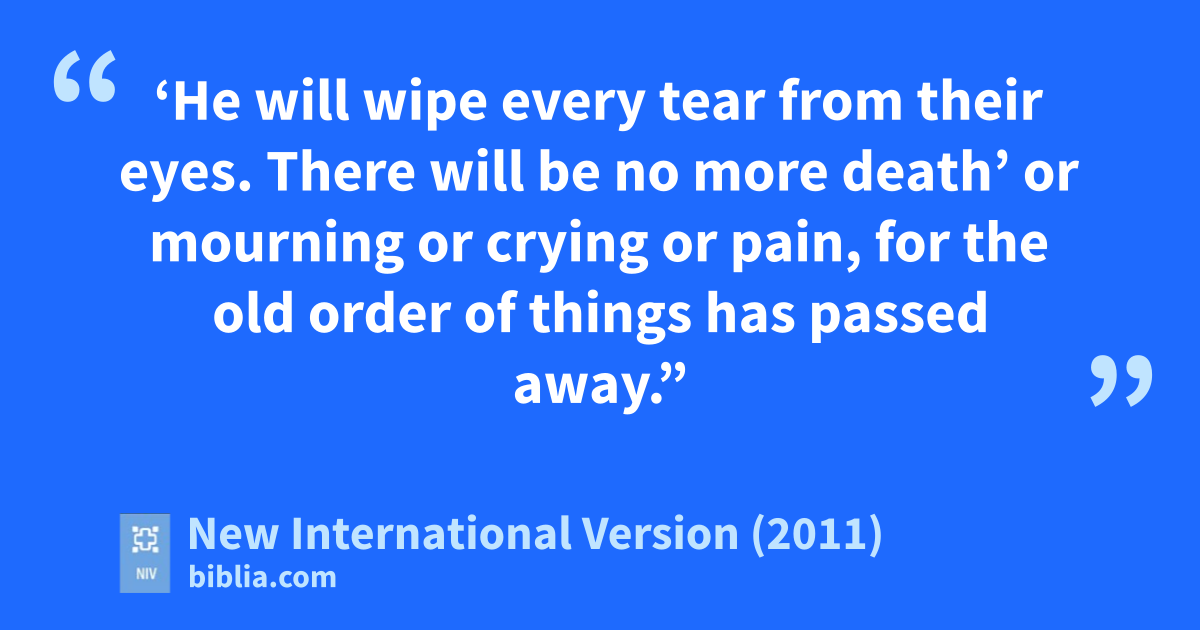 21 Then I saw “a new heaven and a new earth,”a m for the first heaven and the first earth had passed away,n and there was no longer any sea. 2 I saw the Holy City,o the new Jerusalem, coming down out of heaven from God,p prepared as a brideq beautifully dressed for her husband. 3 And I heard a loud voice from the throne saying, “Look! God’s dwelling place is now among the people, and he will dwell with them.r They will be his people, and God himself will be with them and be their God.s 4 ‘He will wipe every tear from their eyes.t There will be no more death’b u or mourning or crying or pain,v for the old order of things has passed away.”w