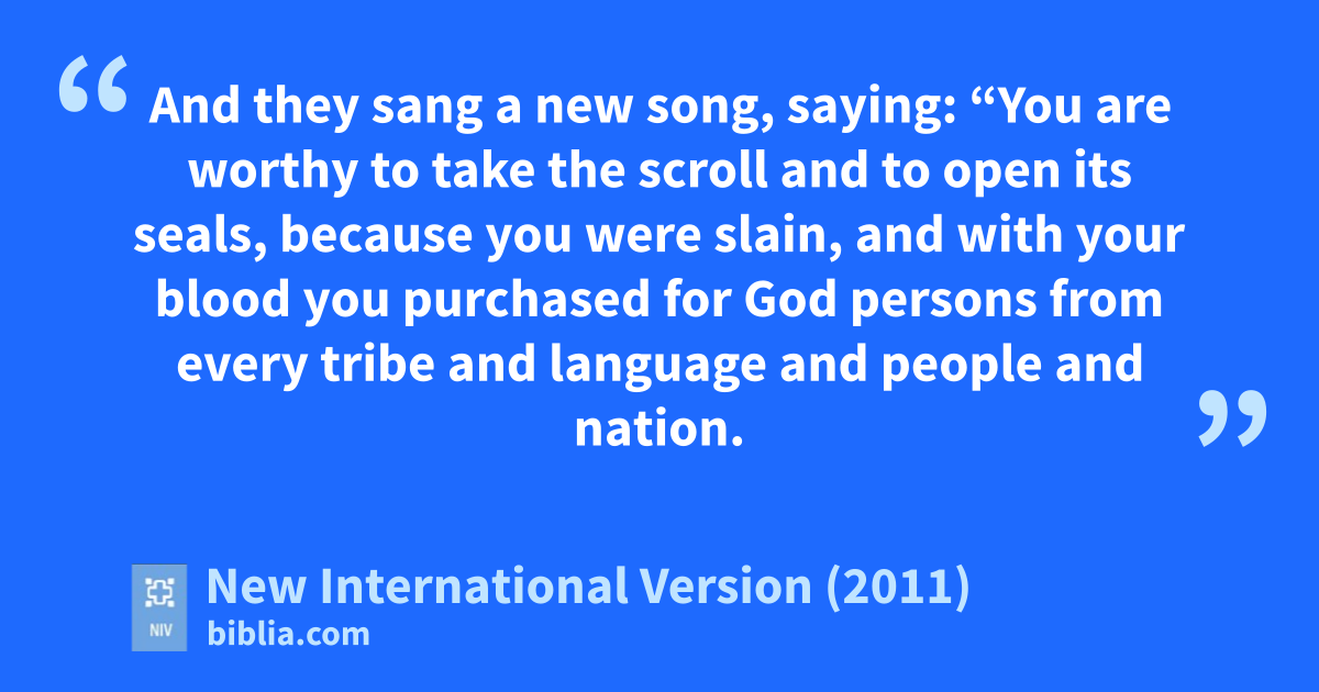 6 Then I saw a Lamb,v looking as if it had been slain, standing at the center of the throne, encircled by the four living creaturesw and the elders.x The Lamb had seven horns and seven eyes,y which are the seven spiritsa z of God sent out into all the earth. 7 He went and took the scroll from the right hand of him who sat on the throne.a 8 And when he had taken it, the four living creaturesb and the twenty-four eldersc fell down before the Lamb. Each one had a harpd and they were holding golden bowls full of incense, which are the prayerse of God’s people. 9 And they sang a new song, saying:f