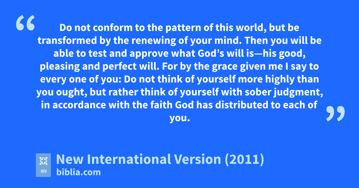 12 Therefore, I urge you,f brothers and sisters, in view of God’s mercy, to offer your bodies as a living sacrifice,g holy and pleasing to God—this is your true and proper worship. 2 Do not conformh to the pattern of this world,i but be transformed by the renewing of your mind.j Then you will be able to test and approve what God’s will isk—his good, pleasingl and perfect will.