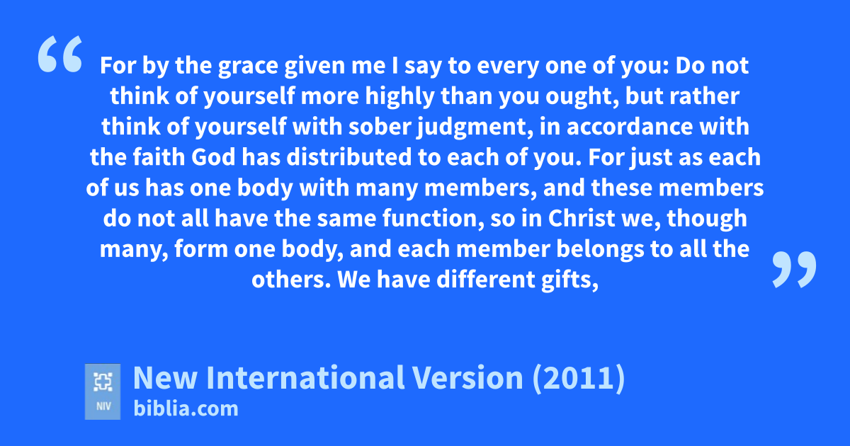 3 For by the grace given mem I say to every one of you: Do not think of yourself more highly than you ought, but rather think of yourself with sober judgment, in accordance with the faith God has distributed to each of you. 4 For just as each of us has one body with many members, and these members do not all have the same function,n 5 so in Christ we, though many, form one body,o and each member belongs to all the others. 6 We have different gifts,p according to the grace given to each of us. If your gift is prophesying,q then prophesy in accordance with youra faith;r 7 if it is serving, then serve; if it is teaching, then teach;s 8 if it is to encourage, then give encouragement;t if it is giving, then give generously;u if it is to lead,b do it diligently; if it is to show mercy, do it cheerfully.