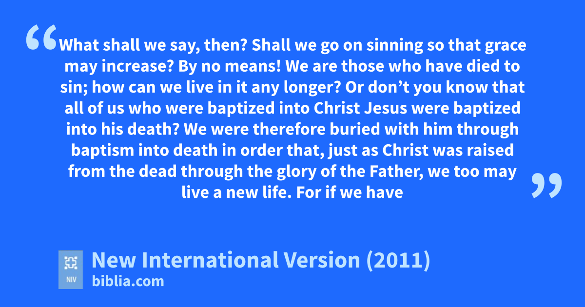 6 What shall we say, then?y Shall we go on sinning so that grace may increase?z 2 By no means! We are those who have died to sin;a how can we live in it any longer? 3 Or don’t you know that all of us who were baptizedb into Christ Jesus were baptized into his death? 4 We were therefore buried with him through baptism into deathc in order that, just as Christ was raised from the deadd through the glory of the Father, we too may live a new life.e