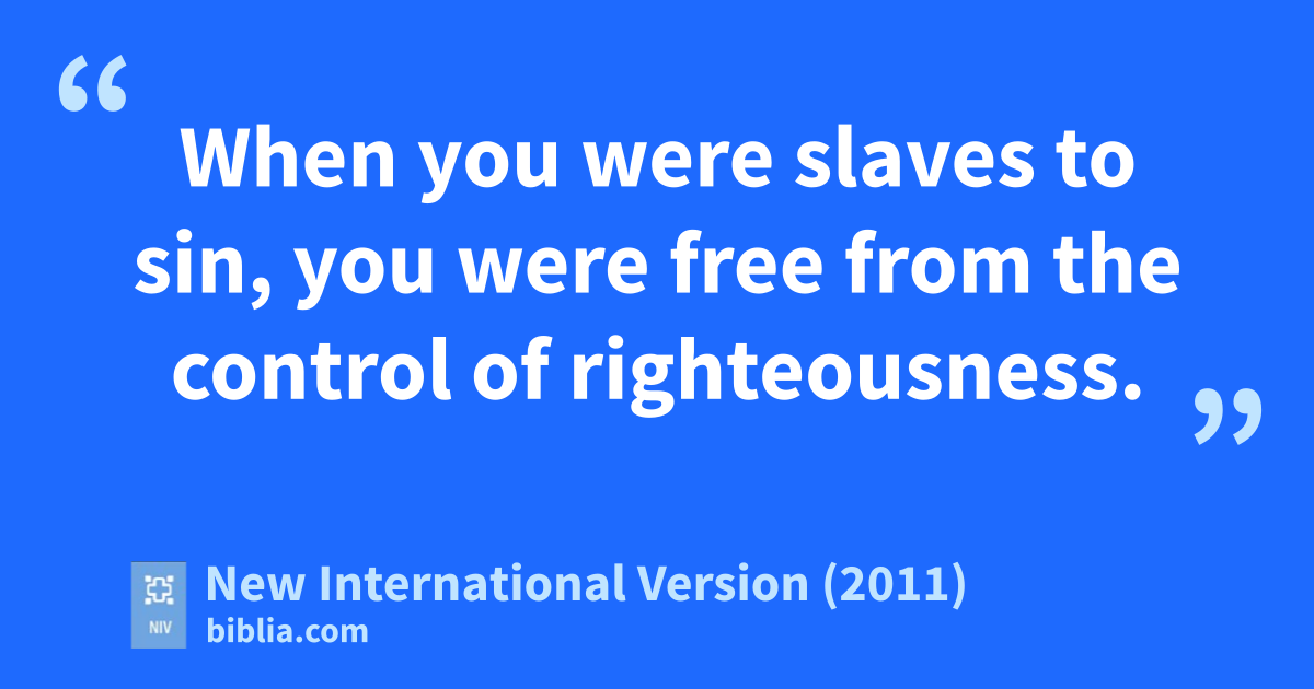 19 I am using an example from everyday lifeg because of your human limitations. Just as you used to offer yourselves as slaves to impurity and to ever-increasing wickedness, so now offer yourselves as slaves to righteousnessh leading to holiness. 20 When you were slaves to sin,i you were free from the control of righteousness.j 21 What benefit did you reap at that time from the things you are now ashamed of? Those things result in death!k 22 But now that you have been set free from sinl and have become slaves of God,m the benefit you reap leads to holiness, and the result is eternal life.n 23 For the wages of sin is death,o but the gift of God is eternal lifep inb Christ Jesus our Lord.