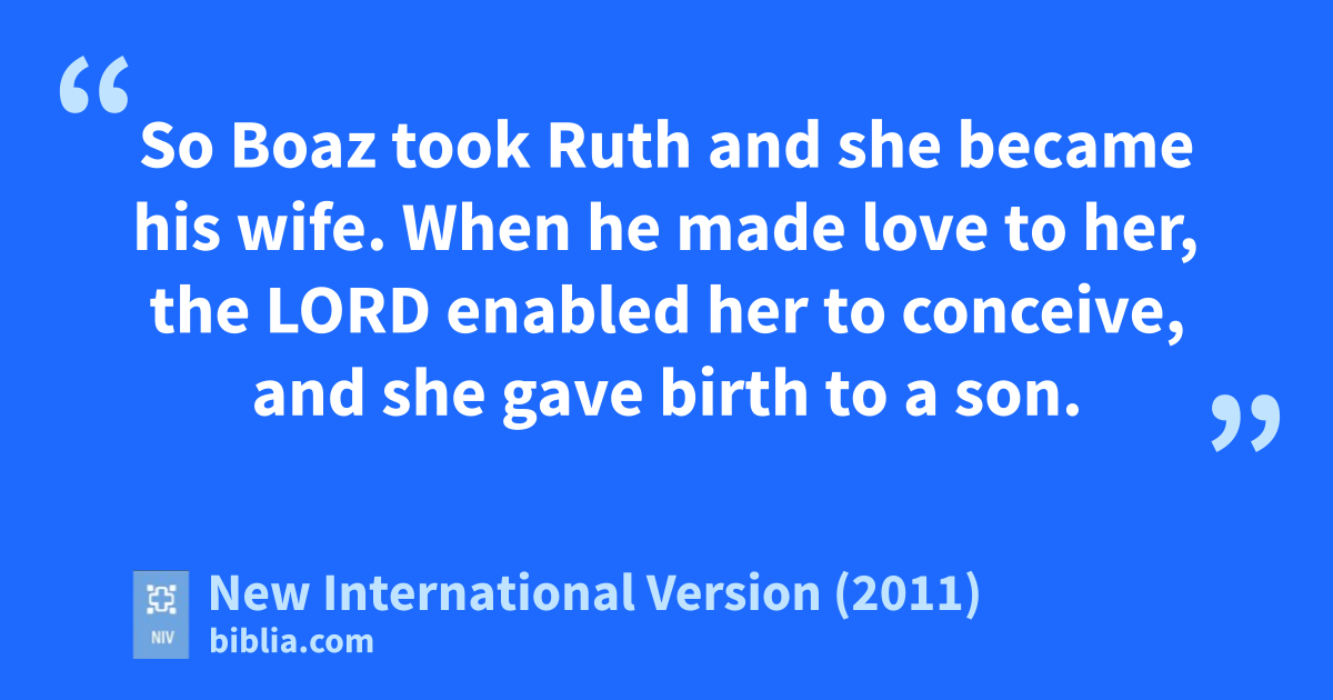 13 So Boaz took Ruth and she became his wife. When he made love to her, the Lord enabled her to conceive,s and she gave birth to a son.t 14 The womenu said to Naomi: “Praise be to the Lord,v who this day has not left you without a guardian-redeemer.w May he become famous throughout Israel! 15 He will renew your life and sustain you in your old age. For your daughter-in-law,x who loves you and who is better to you than seven sons,y has given him birth.”