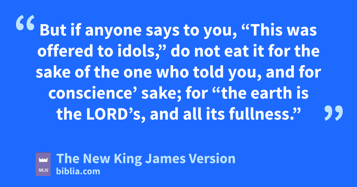 27 If any of those who do not believe invites you to dinner, and you desire to go, peat whatever is set before you, asking no question for conscience’ sake. 28 But if anyone says to you, “This was offered to idols,” do not eat it qfor the sake of the one who told you, and for conscience’ sake; 9for r“the earth is the Lord’s, and all its fullness.” 29 “Conscience,” I say, not your own, but that of the other. For swhy is my liberty judged by another man’s conscience? 30 But if I partake with thanks, why am I evil spoken of for the food tover which I give thanks?
