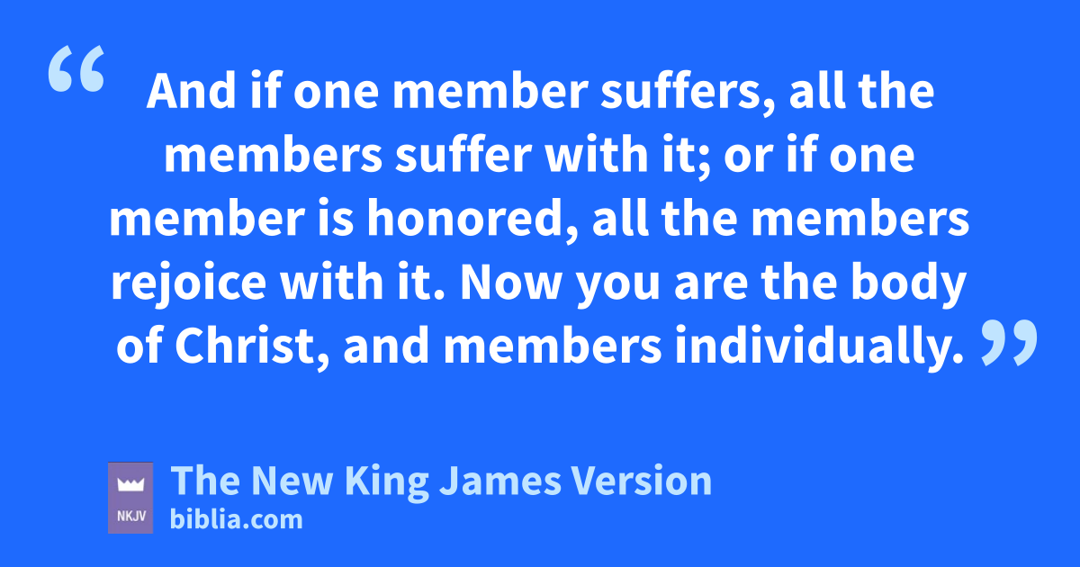 20 But now indeed there are many members, yet one body. 21 And the eye cannot say to the hand, “I have no need of you”; nor again the head to the feet, “I have no need of you.” 22 No, much rather, those members of the body which seem to be weaker are necessary. 23 And those members of the body which we think to be less honorable, on these we bestow greater honor; and our unpresentable parts have greater modesty, 24 but our presentable parts have no need. But God composed the body, having given greater honor to that part which lacks it, 25 that there should be no 8schism in the body, but that the members should have the same care for one another. 26 And if one member suffers, all the members suffer with it; or if one member is honored, all the members rejoice with it.