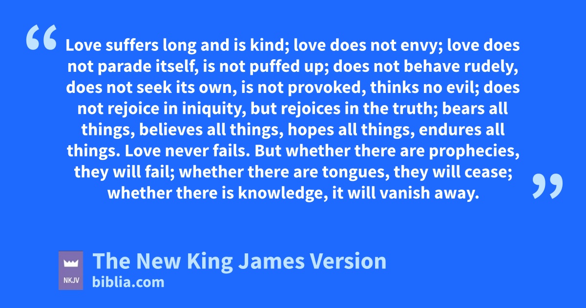 4 dLove suffers long and is ekind; love fdoes not envy; love does not parade itself, is not 2puffed up; 5 does not behave rudely, gdoes not seek its own, is not provoked, 3thinks no evil; 6 hdoes not rejoice in iniquity, but irejoices in the truth; 7 jbears all things, believes all things, hopes all things, endures all things.