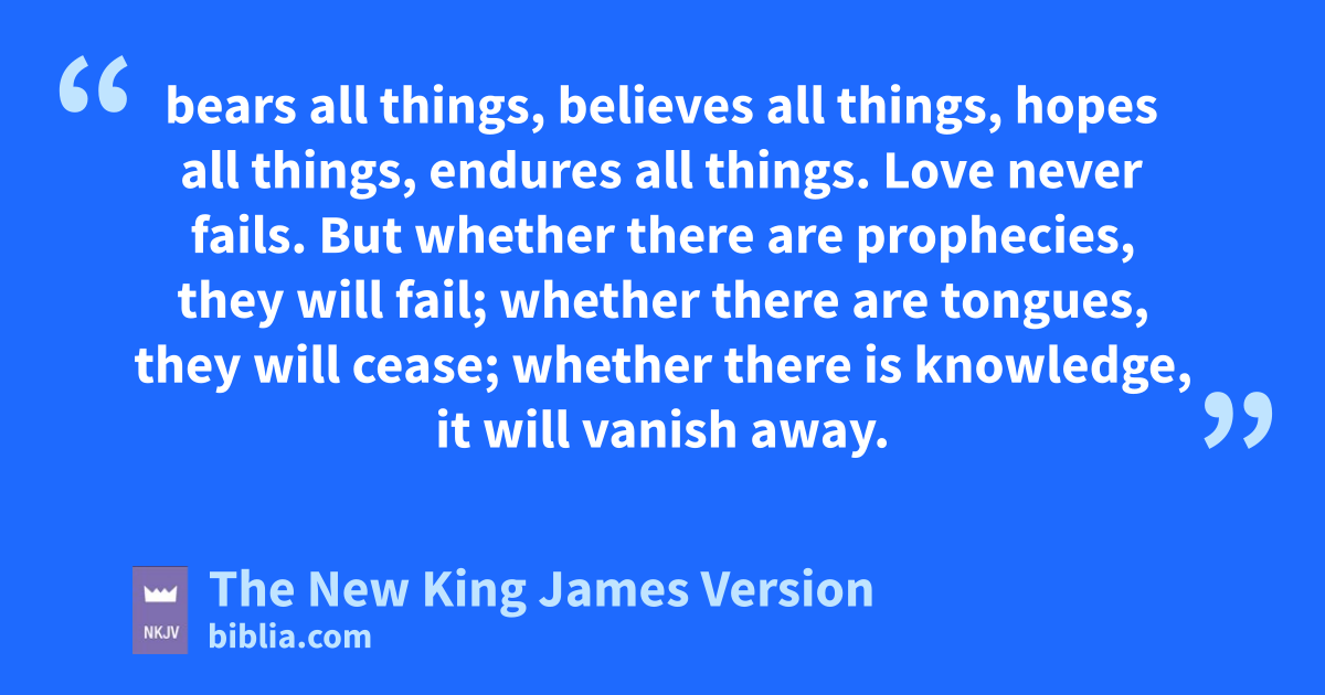 8 Love never fails. But whether there are prophecies, they will fail; whether there are tongues, they will cease; whether there is knowledge, it will vanish away. 9 kFor we know in part and we prophesy in part. 10 But when that which is 4perfect has come, then that which is in part will be done away.