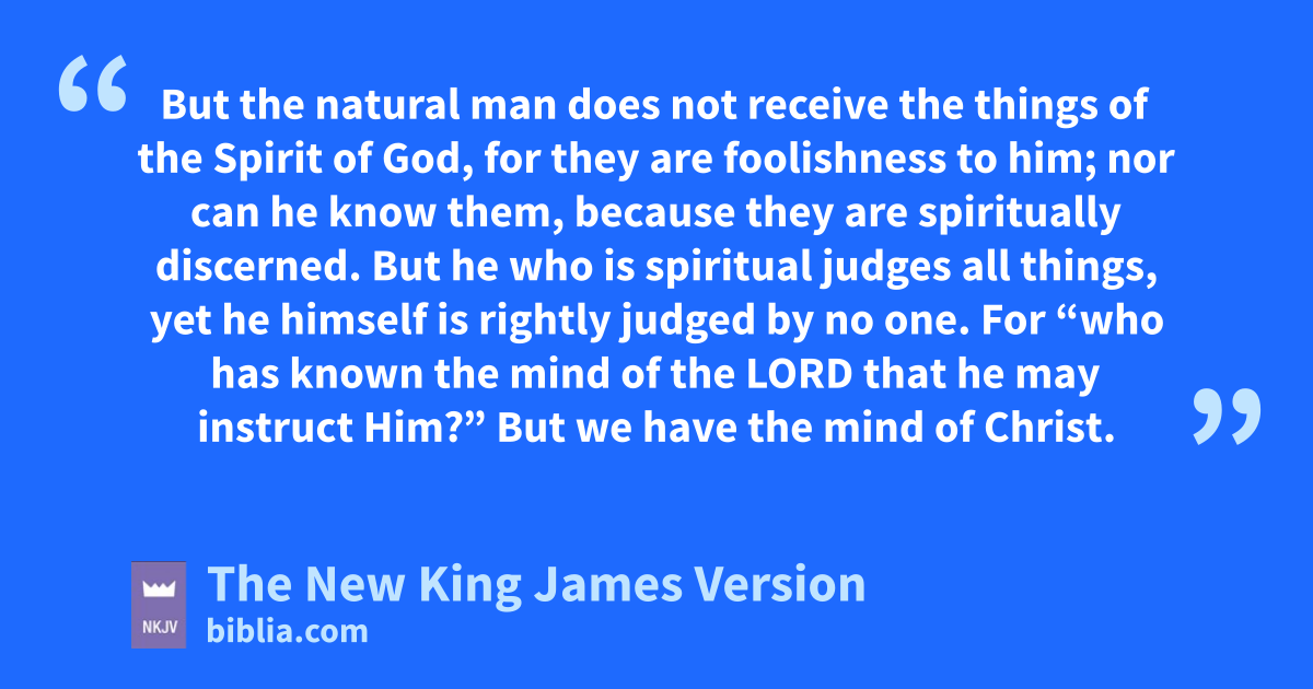 13 These things we also speak, not in words which man’s wisdom teaches but which the 4Holy Spirit teaches, comparing spiritual things with spiritual. 14 nBut the natural man does not receive the things of the Spirit of God, for they are foolishness to him; nor can he know them, because they are spiritually discerned. 15 But he who is spiritual judges all things, yet he himself is rightly judged by no one. 16 For o“who has known the mind of the Lord that he may instruct Him?” pBut we have the mind of Christ.