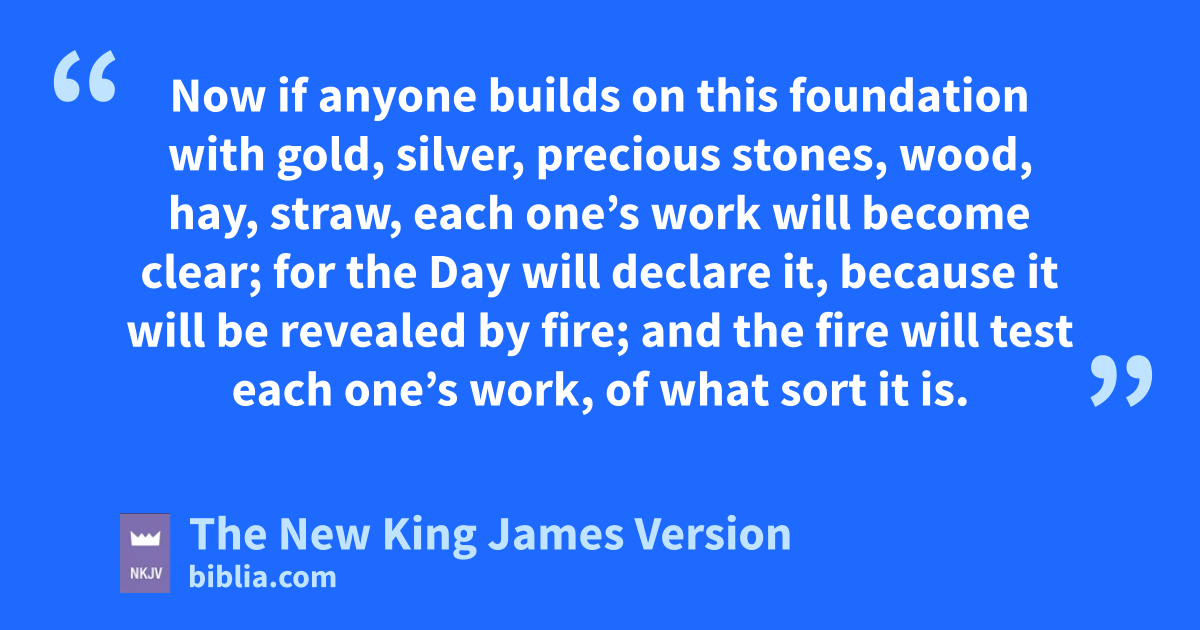 9 For jwe are God’s fellow workers; you are God’s field, you are kGod’s building. 10 lAccording to the grace of God which was given to me, as a wise master builder I have laid mthe foundation, and another builds on it. But let each one take heed how he builds on it. 11 For no other foundation can anyone lay than nthat which is laid, owhich is Jesus Christ. 12 Now if anyone builds on this foundation with gold, silver, precious stones, wood, hay, straw, 13 each one’s work will become clear; for the Day pwill declare it, because qit will be revealed by fire; and the fire will test each one’s work, of what sort it is. 14 If anyone’s work which he has built on it endures, he will receive a reward. 15 If anyone’s work is burned, he will suffer loss; but he himself will be saved, yet so as through fire.