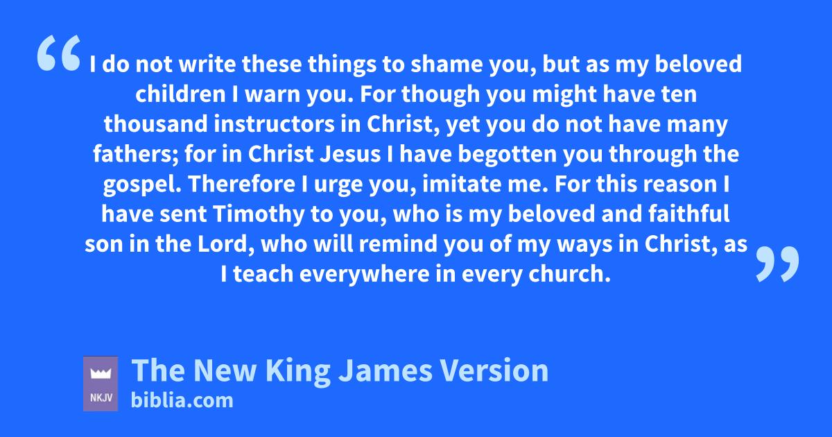 14 I do not write these things to shame you, but oas my beloved children I warn you. 15 For though you might have ten thousand instructors in Christ, yet you do not have many fathers; for pin Christ Jesus I have begotten you through the gospel. 16 Therefore I urge you, qimitate me. 17 For this reason I have sent rTimothy to you, swho is my beloved and faithful son in the Lord, who will tremind you of my ways in Christ, as I uteach everywhere vin every church.