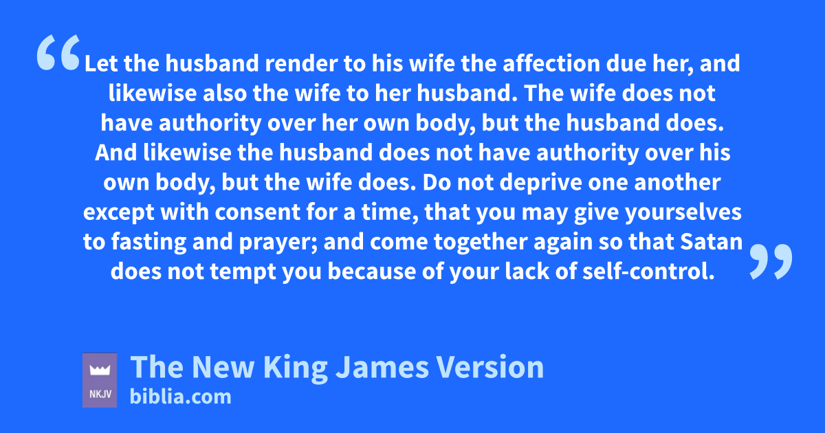 aIt is good for a man not to touch a woman. 2 Nevertheless, because of sexual immorality, let each man have his own wife, and let each woman have her own husband. 3 bLet the husband render to his wife the affection due her, and likewise also the wife to her husband. 4 The wife does not have authority over her own body, but the husband does. And likewise the husband does not have authority over his own body, but the wife does. 5 cDo not deprive one another except with consent for a time, that you may give yourselves to fasting and prayer; and come together again so that dSatan does not tempt you because of your lack of self-control. 6 But I say this as a concession, enot as a commandment. 7 For fI wish that all men were even as I myself. But each one has his own gift from God, one in this manner and another in that.
