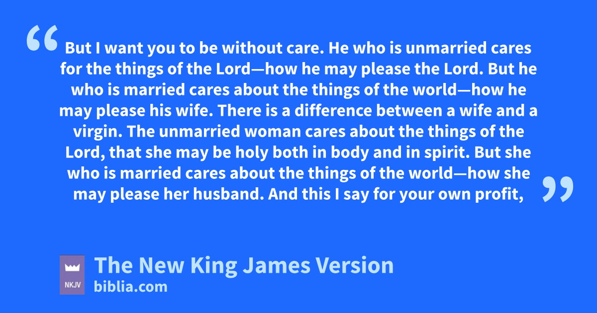 32 But I want you to be without 2care. cHe who is unmarried 3cares for the things of the Lord—how he may please the Lord. 33 But he who is married cares about the things of the world—how he may please his wife. 34 There is a difference between a wife and a virgin. The unmarried woman dcares about the things of the Lord, that she may be holy both in body and in spirit. But she who is married cares about the things of the world—how she may please her husband. 35 And this I say for your own profit, not that I may put a leash on you, but for what is proper, and that you may serve the Lord without distraction.