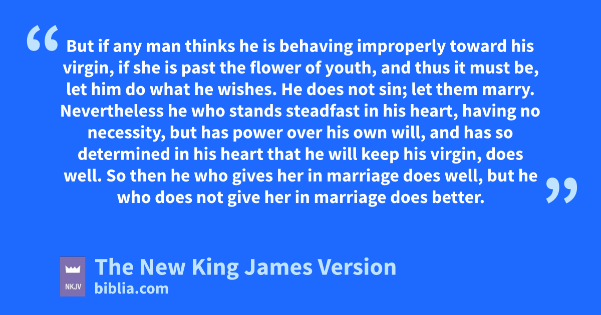 36 But if any man thinks he is behaving improperly toward his 4virgin, if she is past the flower of youth, and thus it must be, let him do what he wishes. He does not sin; let them marry. 37 Nevertheless he who stands steadfast in his heart, having no necessity, but has power over his own will, and has so determined in his heart that he will keep his 5virgin, does well. 38 eSo then he who gives 6her in marriage does well, but he who does not give her in marriage does better.