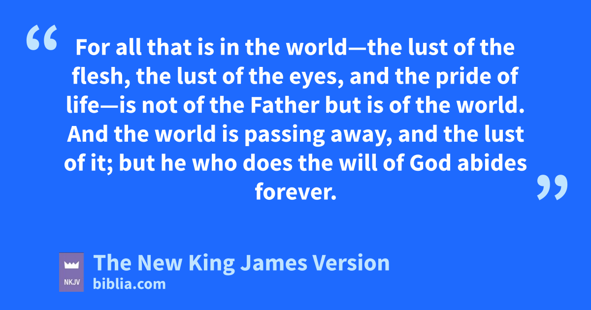 15 vDo not love the world or the things in the world. wIf anyone loves the world, the love of the Father is not in him. 16 For all that is in the world—the lust of the flesh, xthe lust of the eyes, and the pride of life—is not of the Father but is of the world. 17 And ythe world is passing away, and the lust of it; but he who does the will of God abides forever.