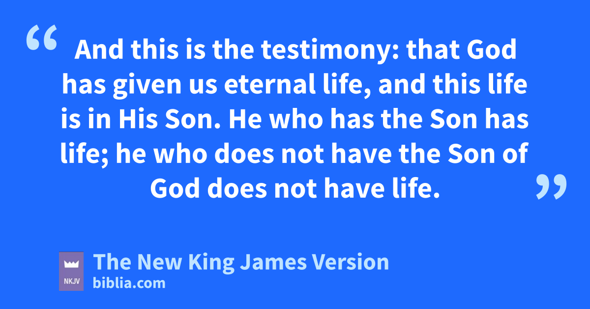 9 If we receive nthe witness of men, the witness of God is greater; ofor this is the witness of 3God which He has testified of His Son. 10 He who believes in the Son of God phas the witness in himself; he who does not believe God qhas made Him a liar, because he has not believed the testimony that God has given of His Son. 11 And this is the testimony: that God has given us eternal life, and this life is in His Son. 12 rHe who has the Son has 4life; he who does not have the Son of God does not have 4life. 13 These things I have written to you who believe in the name of the Son of God, that you may know that you have eternal life, 5and that you may continue to believe in the name of the Son of God.