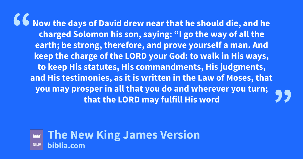 2 Now athe days of David drew near that he should die, and he 1charged Solomon his son, saying: 2 b“I go the way of all the earth; cbe strong, therefore, and prove yourself a man. 3 And keep the charge of the Lord your God: to walk in His ways, to keep His statutes, His commandments, His judgments, and His testimonies, as it is written in the Law of Moses, that you may dprosper in all that you do and wherever you turn; 4 that the Lord may efulfill His word which He spoke concerning me, saying, f‘If your sons take heed to their way, to gwalk before Me in truth with all their heart and with all their soul,’ He said, h‘you shall not lack a man on the throne of Israel.’