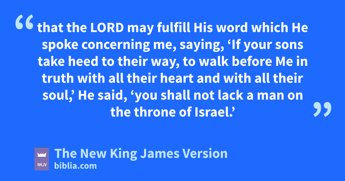 2 Now athe days of David drew near that he should die, and he 1charged Solomon his son, saying: 2 b“I go the way of all the earth; cbe strong, therefore, and prove yourself a man. 3 And keep the charge of the Lord your God: to walk in His ways, to keep His statutes, His commandments, His judgments, and His testimonies, as it is written in the Law of Moses, that you may dprosper in all that you do and wherever you turn; 4 that the Lord may efulfill His word which He spoke concerning me, saying, f‘If your sons take heed to their way, to gwalk before Me in truth with all their heart and with all their soul,’ He said, h‘you shall not lack a man on the throne of Israel.’