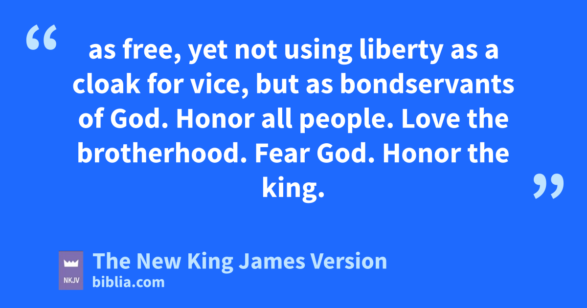 13 pTherefore submit yourselves to every 3ordinance of man for the Lord’s sake, whether to the king as supreme, 14 or to governors, as to those who are sent by him for the punishment of evildoers and for the praise of those who do good. 15 For this is the will of God, that by doing good you may put to silence the ignorance of foolish men—16 qas free, yet not rusing liberty as a cloak for 4vice, but as bondservants of God. 17 Honor all people. Love the brotherhood. Fear sGod. Honor the king.