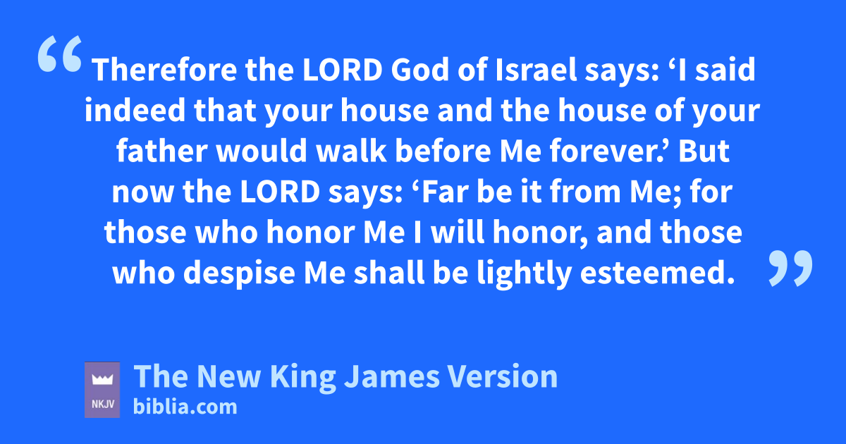27 Then a tman of God came to Eli and said to him, “Thus says the Lord: u‘Did I not clearly reveal Myself to the house of your father when they were in Egypt in Pharaoh’s house? 28 Did I not vchoose him out of all the tribes of Israel to be My priest, to offer upon My altar, to burn incense, and to wear an ephod before Me? And wdid I not give to the house of your father all the offerings of the children of Israel made by fire? 29 Why do you xkick at My sacrifice and My offering which I have commanded in My ydwelling place, and honor your sons more than zMe, to make yourselves fat with the best of all the offerings of Israel My people?’ 30 Therefore the Lord God of Israel says: a‘I said indeed that your house and the house of your father would walk before Me forever.’ But now the Lord says: b‘Far be it from Me; for those who honor Me I will honor, and cthose who despise Me shall be lightly esteemed. 31 Behold, dthe days are coming that I will cut off your 2arm and the arm of your father’s house, so that there will not be an old man in your house. 32 And you will see an enemy in My dwelling place, despite all the good which God does for Israel. And there shall not be ean old man in your house forever. 33 But any of your men whom I do not cut off from My altar shall consume your eyes and grieve your heart. And all the descendants of your house shall die in the flower of their age. 34 Now this shall be fa sign to you that will come upon your two sons, on Hophni and Phinehas: gin one day they shall die, both of them. 35 Then hI will raise up for Myself a faithful priest who shall do according to what is in My heart and in My mind. iI will build him a sure house, and he shall walk before jMy anointed forever. 36 kAnd it shall come to pass that everyone who is left in your house will come and bow down to him for a piece of silver and a morsel of bread, and say, “Please, 3put me in one of the priestly positions, that I may eat a piece of bread.” ’ ”